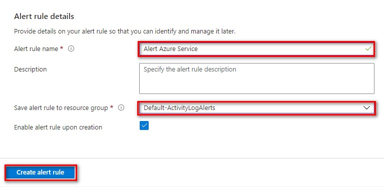 12. ทำการใส่ข้อมูล Alert rule name, Description, Save alert rule to resource group และ เลือก Enable alert rule upon creation แล้วเลือก Create alert rule