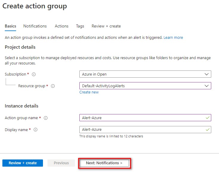 7. ในหน้า Create action group ในหัวข้อ Basics ให้เลือก Subscription, Resource group and Instance details ตามที่เราต้องการ แล้วเลือก Next: Notifications >