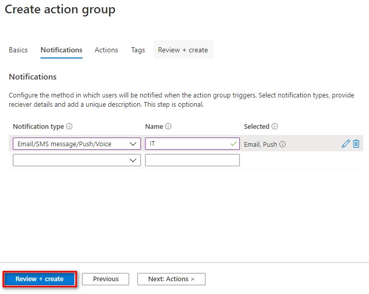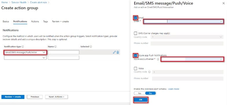 8. ทำการเลือก Notification type เป็น Email/SMS message/Push/Voice แล้วเลือกรูปแบบตามต้องการ เช่น Email, Azure app Push Notifications แล้วเลือก OK