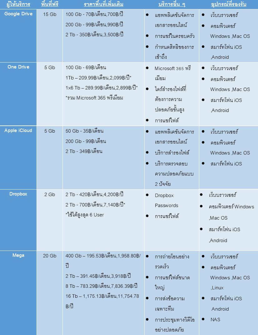 หากเอ่ยถึง Cloud Storage หลายๆคนอาจไม่รู้จักว่าคืออะไร หรืออาจเคยได้ยินบ้าง แต่หากเอ่ยถึง Google Drive ,One Drive หรือ Apple iCloud เชื่อว่าหลายๆคนต้องรู้จักอย่างแน่นอน เพราะในปัจจุบันบริการ Cloud Storage เข้ามามีบทบาทในชีวิตประจำวันของเรามากขึ้นผ่านแอพพลิเคชั่นต่าง ๆ โดยเราอาจไม่รู้ว่าบริการเหล่านั้นก็คือ Cloud Storage นั่นเอง Cloud Storage ในก่อนหน้านั้นเป็นบริการทางเลือก เนื่องจากผู้ใช้มักจะบันทึกข้อมูลลงบนอุปกรณ์บันทึกข้อมูลอย่าง Flash Drive ,Extranal Drive หรือบันทึกลงในฮาร์ดดิสคอมพิวเตอร์ของพวกเขา แต่ในปัจจุบัน Cloud Storage กลายมาเป็นสิ่งที่จำเป็นที่ผู้ใช้อุปกรณ์ไอทีจะต้องมีไว้อย่างน้อย 1 โปรแกรม ในปัจจุบันมีผู้ให้บริการ Cloud Storage อยู่หลายราย ทำให้ผู้ใช้สามารถเลือกผู้ให้บริการที่เหมาะสมกับการใช้งานได้มากขึ้น โดยเราจะมาดูผู้ให้บริการรายต่าง ๆที่นิยมในปัจจุบันว่ามีอะไรบ้างครับ