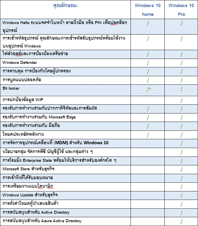 จากตารางเปรียบเทียบคุณลักษณะการทำงานของ Windows 10 home และ Windows 10 Pro จะเห็นว่ามีการแบ่งความสามารถในขั้นสูงและความสามารถด้านธุรกิจไปอยู่บน Windows 10 Pro นั่นก็เพราะ Microsoft ปรับให้รุ่น home มีราคาที่ถูกกว่า และมองว่าผู้ใช้ทั่วไปไม่จำเป็นต้องใช้ฟีเจอร์ขั้นสูงเหล่านี้นั่นเอง