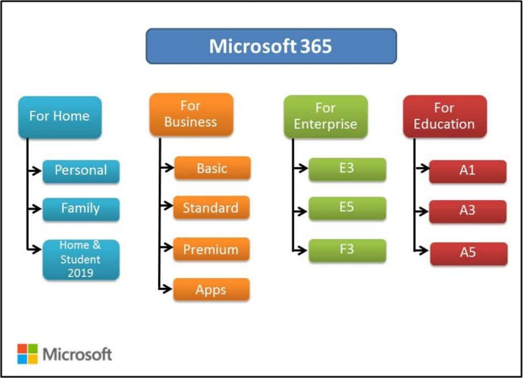 Microsoft office 365 จะแบ่งประเภทการใช้งานหลักเป็นสี่แบบคือ ประเภทสำหรับใช้งานภายในบ้าน ประเภทใช้งานสำหรับธุรกิจ ประเภทสำหรับใช้งานในองค์กร และสำหรับการศึกษาซึ่งทั้งสามประเภทนี้อก็แบ่งเป็นแพคเกจย่อยออกมาอีกเพื่อรองรับความต้องการของลูกค้า โดยมีแผนภาพดังนี้