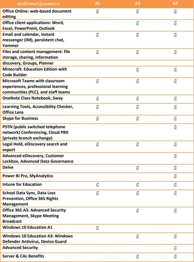 สำหรับประเภทสำหรับการศึกษานั้น Microsoft ได้ใส่ผลิตภัณฑ์ที่ใช้ประกอบสำหรับการศึกษามาให้เป็นส่วนใหญ่ ซึ่งทำให้ตอบโจทย์ต่อการนำเอามาใช้กลุ่มขององค์กรทางการศึกษาเป็นอย่างมาก โดยแพคเกจสำหรับการศึกษาจะมีดังนี้