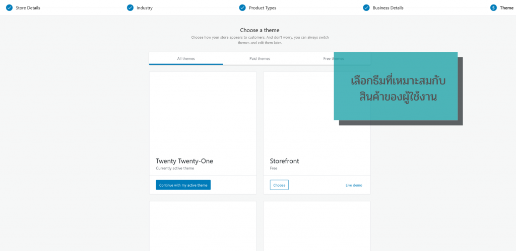 1. ในขั้นตอนสุดท้าย จะเป็นการเลือกธีมที่เหมาะสมกับสินค้าของผู้ใช้ โดยผู้ใช้สามารถเลือกได้ว่าจะใช้ธีมฟรี หรือธีมที่มีค่าใช้จ่าย