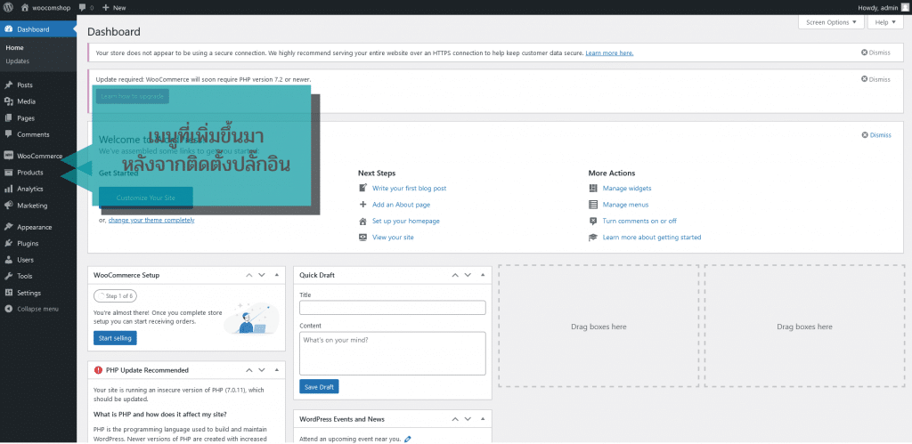 เมื่อผู้ใช้ติดตั้งปลั๊กอิน Woocommerce เรียบร้อยแล้ว จะพบว่ามีเมนูเพิ่มขึ้นมาในหน้า Dashboard ดังนี้